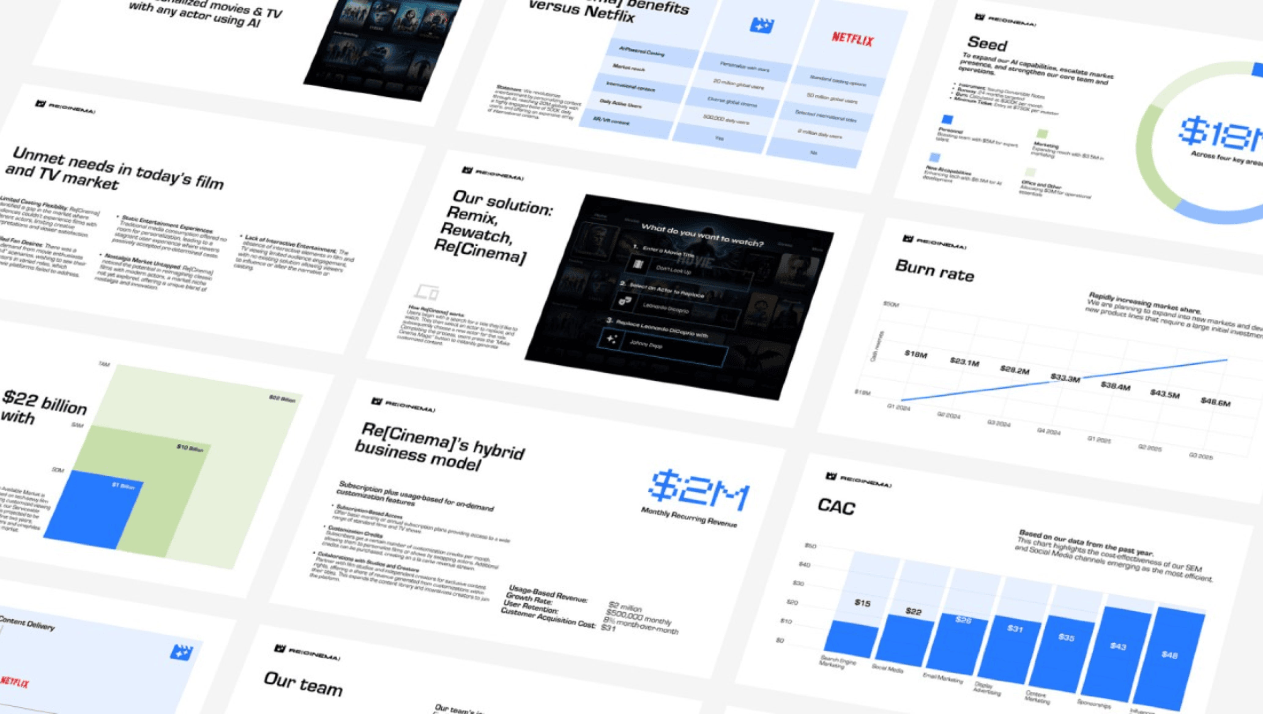 Below, I laid out Re[Cinema]’s business as hybrid subscription and usage-based. Key info is distilled into plain text, and the page is neatly divided into quarters. Again, divide slides into sections like halves, thirds, etc. to ensure your message comes through, and looks good in the process. Check it out...
